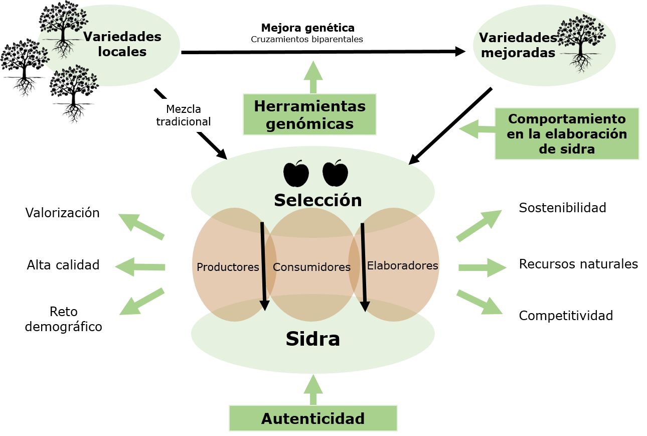 El cultivo de manzana de sidra enfrenta desafíos como la vecería, que origina problemas de suministro a la industria elaboradora y fluctuaciones de precios de la manzana. La DOP "Sidra de Asturias" regula la producción, trazabilidad y calidad de la sidra hecha en Asturias a partir de 76 variedades locales seleccionadas, entre las que se incluyen 18 variedades obtenidas por el Programa de Mejora del SERIDA, caracterizadas por su resistencia a enfermedades, producción regular y calidad del fruto. En este contexto, el proyecto VAL-CIDAPP propone evaluar el potencial de estas variedades mejoradas en fermentaciones controladas, y analizar su idoneidad para la producción de sidra. Uno de los enfoques novedosos del proyecto es la aplicación del análisis de isótopos estables. La identificación de los perfiles isotópicos característicos de las sidras elaboradas en Asturias permitirá su diferenciación de aquellas producidas en otras regiones. Por otro lado, el proyecto pretende avanzar en la mejora genética de la especie, a partir de estudios de asociación del genoma completo (GWAS) con el objetivo de identificar loci asociados a los perfiles fenólicos y polialcoholes. Asimismo, se llevará a cabo la reconstrucción de pedigríes, lo que también contribuirá a mejorar la eficiencia del proceso de mejora mediante la prevención de la endogamia durante el diseño de nuevos cruzamientos.