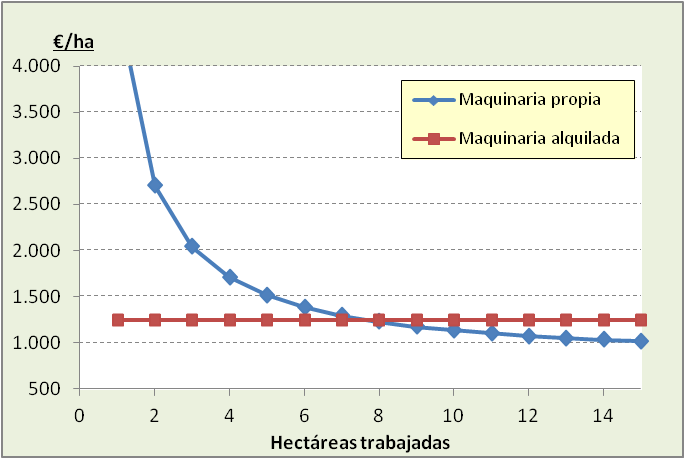 La eficiencia de la maquinaria propia depende directamente del volumen de trabajo que generemos para la misma en la explotación y por tanto de la superficie que dedicamos a cada cultivo. El coste por hectárea de la utilización de la maquinaria propia decrecerá de forma exponencial a medida que aumentamos la superficie de trabajo y por tanto las horas de utilización de los aperos. Una maquinaría agrícola genera gastos aunque no trabaje en todo el año.